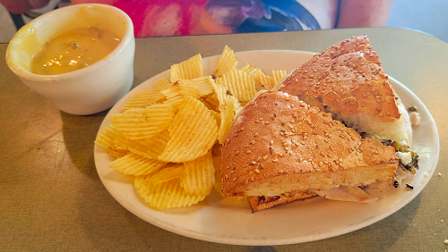 Jan got a cup of the Broccoli-Cheese Soup and a Half Turkey Muffuletta,