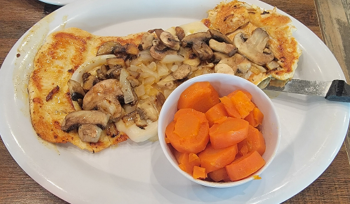 Jan got her usual Fiesta Chicken with Cole Slaw and Buttered Carrots.