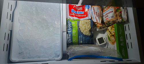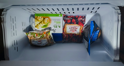 When we got home, I started stocking the freezer. Since I haven’t hooked up the water feed to the icemaker yet, I bought a bag of ice to fill the bin. And as I was putting the frozen stuff into the right-hand bin, Jan walked over to look.
