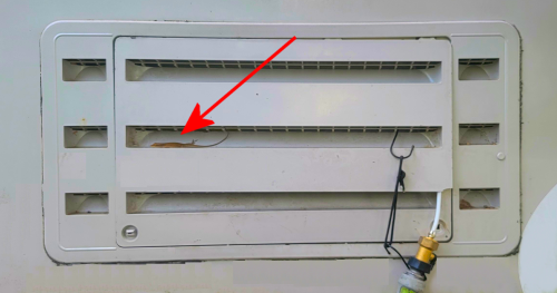 Next up, I tucked away the water line for the icemaker into the compartment, leaving only the water hose hanging outside. The red arrow is pointing to our local lizardly friend already making himself at home.
